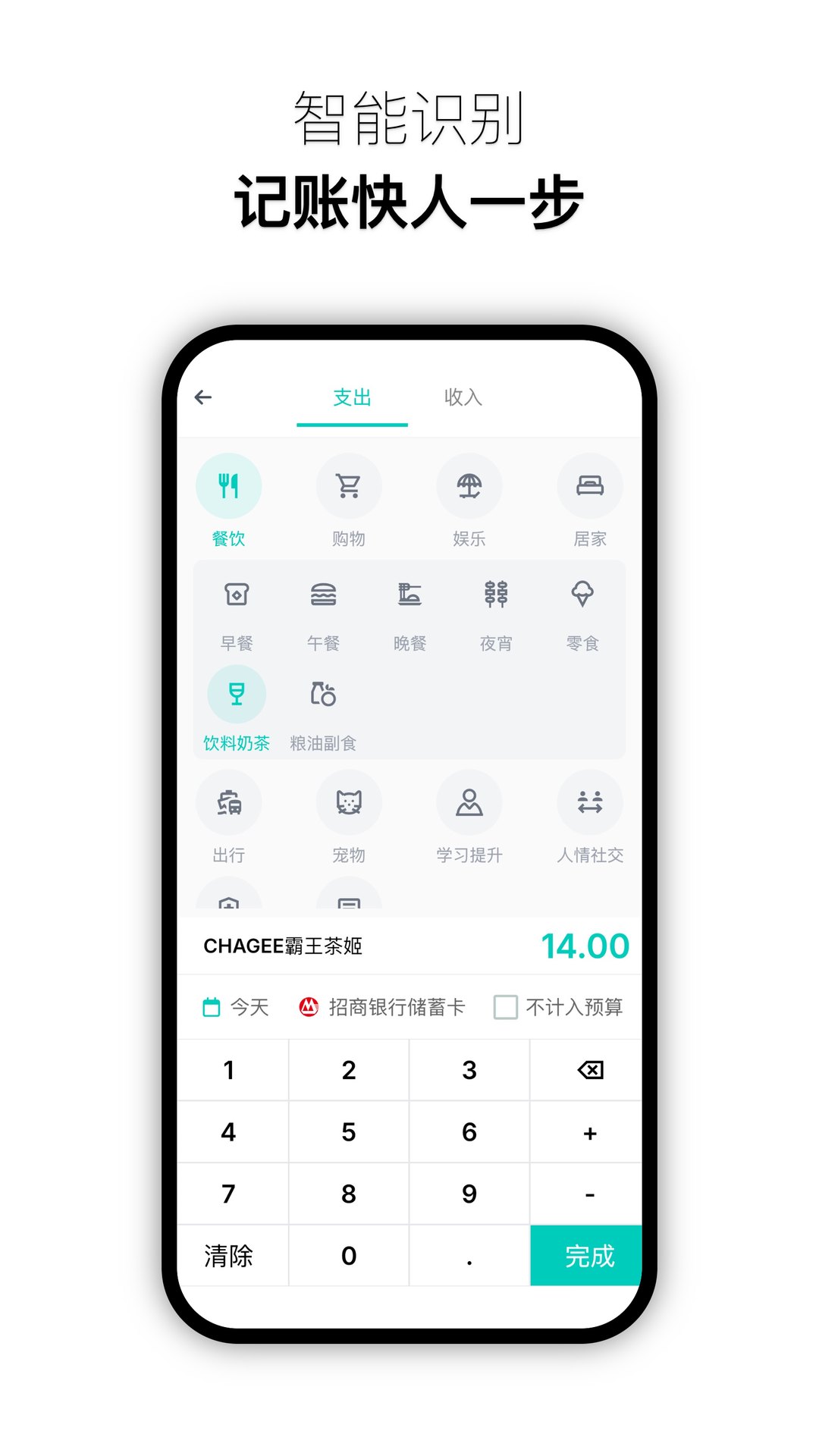 2.输入金额,并从预设类别(如餐饮、购物、交通等)中选择对应标签,或自定义新增类别