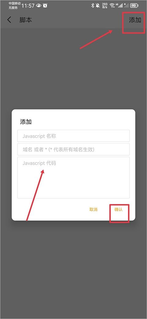 4. 然后点击右上角添加,并将脚本代码粘贴至框中,点击确认即可