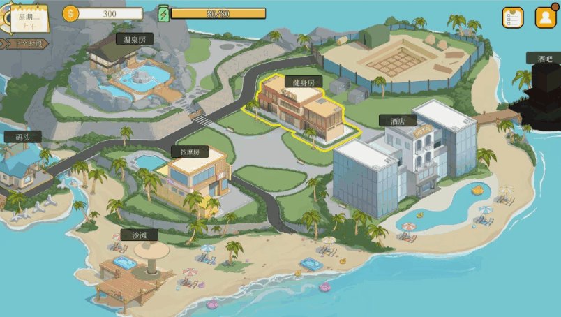1. 进入游戏后先查看蘑菇岛大地图,选择健身房、酒店等场景开启打工