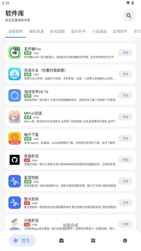 2. 进入首页之后,有详细的软件资源分类,音乐类、听书类以及影视类等都有