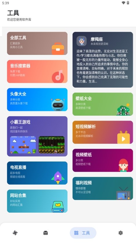 5. “工具”页面,拥有在线影视、在线音乐以及壁纸大全等