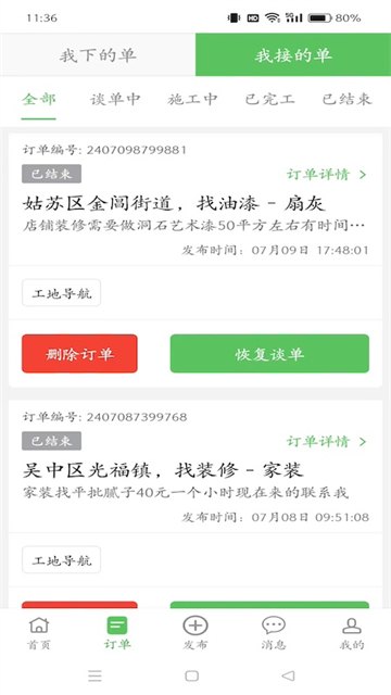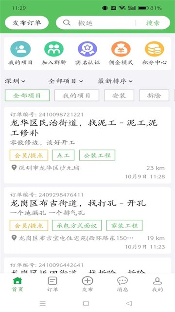 登录APP后面,选择“订单”师傅们可以在这里看到订单信息,例如招什么工种、工程量上多少,还有具体是干什么的,最主要的是还有薪资是多少,不过师傅要是想去接单其他地方的单,可以点击右上角的“切换城市”