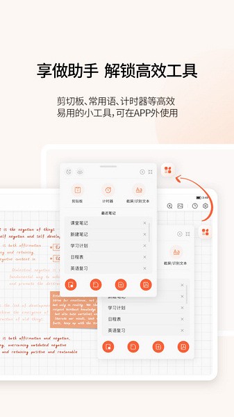 支持智能搜索手写内容、文字内容、录音内容、图片内容,智能翻译多种语言,智能分析重点词汇、内容OCR扫描识别、图片转文字、实时手写转文字、录音转文字、实时语音转文字方式转化为可编辑笔记。