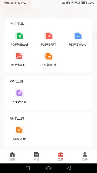 支持包括PDF转EXCEL,PDF转PPT,PDF转WORD,图片转PDF,PDF转图片,PPT转PDF,AI写文案多种工具使用,满足您格式转换的需求。