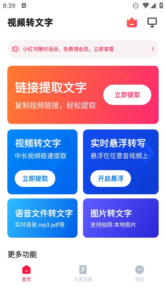 1. 打开视频转文字app,点击链接提取文字右侧的立即提取。