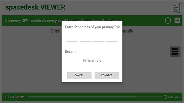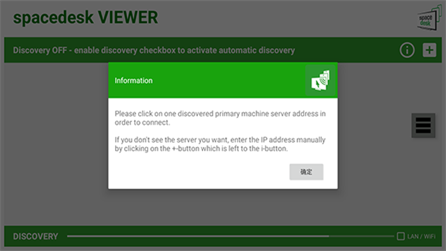 1. 首先需要在手机上与电脑上都安装软件,保证设备都连接同一局域网,电脑上安装好spacedesk软件后,在同一局域网内,软件内会自动搜索到此电脑,如果没有搜索到,也可以点击中间的加号,进行添加,ip地址为电脑软件中显示的ip。