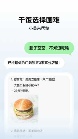 3. 不知道吃啥?让小美帮你“随便点点”:小美会挖些你没吃过的新口味,给到更多选择;你的喜欢或不喜欢都会记在心里,越用越懂你。