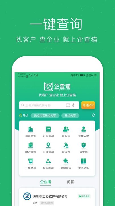 支持企业名或人名等关键字的智能搜索,可一键查企业、查老板。
