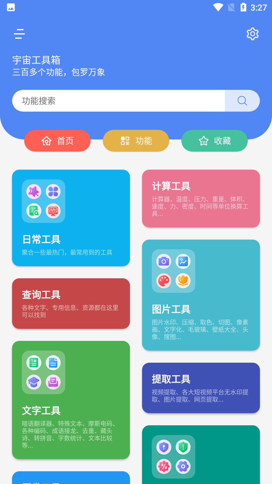 为用户提供日常工具、系统工具、图片工具、查询工具,提取工具,开发工具等十个类别的分类,非常的齐全,你可以根据需求进行分类查找,功能简直不要太多。