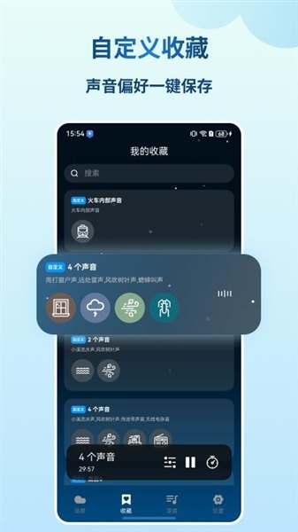 2. 在收藏页面,为我们展示了多元化的白噪音素材,一键播放。