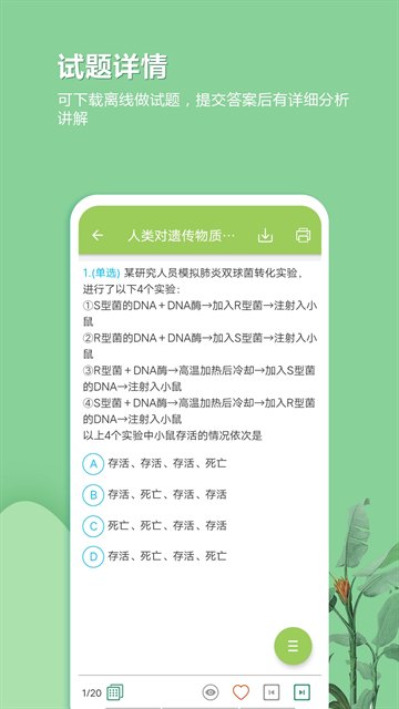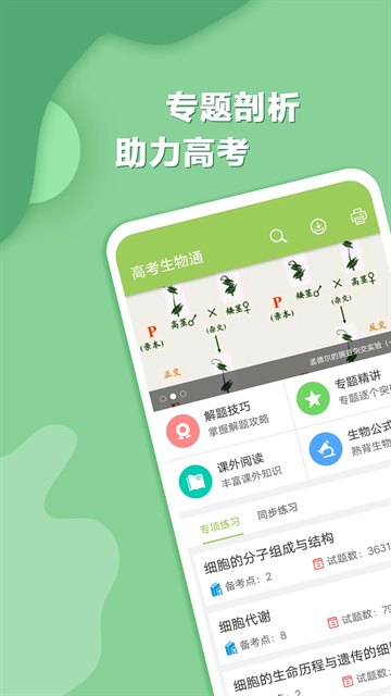 高考生物通app是专为广大学子打造的生物学习软件,帮助学生更好的回忆复习知识点,助力高考。软件中细化涵盖高考生物科目的专题练习题目,每一道题目都有详细的讲解分析,帮助学生更好的理解各种难点重点,同时软件还可以随时随地随意缓存,没有网络一样学习!