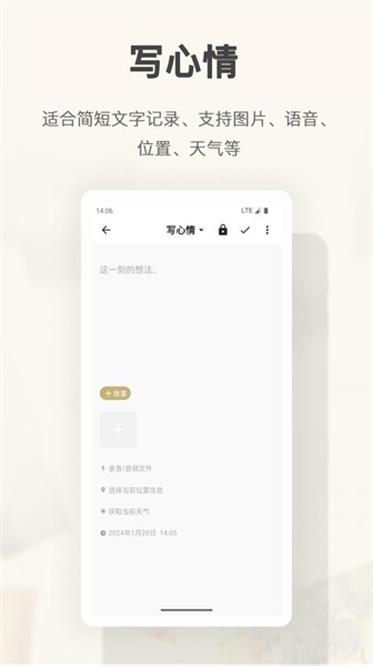 4. 点击【写心情】,可输入文字、添加故事,记录当下的想法,还能附加录音、位置和天气。