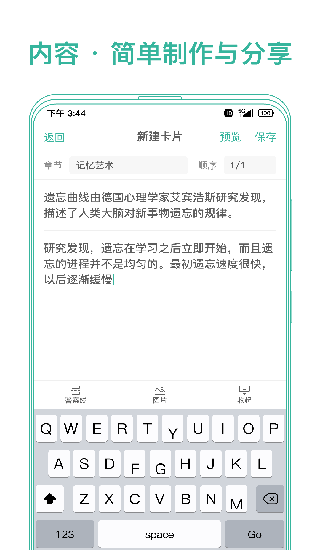 3. 比如,屏幕上先显示英语单词记忆卡的正面单词,你尝试回忆背面的释义、例句等内容,