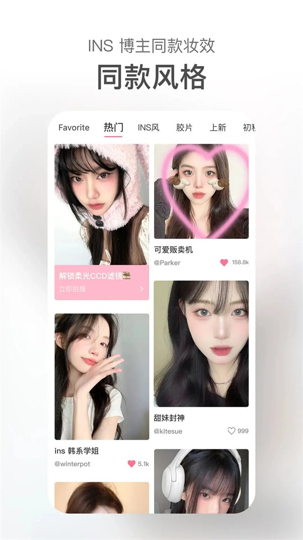 杂志风、ins风、日韩风、可盐、可甜多种美妆任你选择!更有百变姿势,一键Get拍照姿势+美妆;