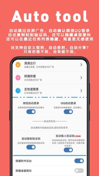 Auto tool是由灵昆微一软件工作室为大家打造的自动跳广告服务软件,凭借其独特的自动化和定制化功能,为用户提供了前所未有的操作体验,Auto tool专门针对拥有开屏广告的app量身打造,可以帮助用户很好的跳过烦人的开屏广告,免去手动点击“跳过”按钮,让你享受无广告弹窗的干扰!