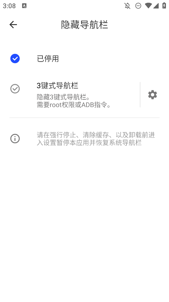 2.进入隐藏导航栏界面,可见状态为【已停用】,点击【3键式导航栏】。