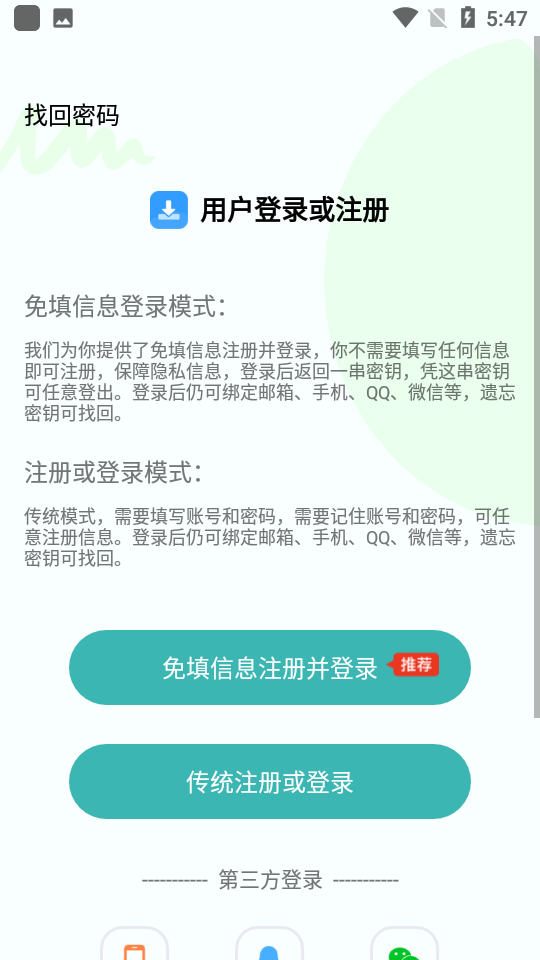 我们为你提供了免填信息注册并登录,你不需要填写任何信息即可注册,保障隐私信息,登录后返回一串密钥,凭这串密钥可任意登出。登录后仍可绑定邮箱、手机、QQ、微信等,遗忘密钥可找回。