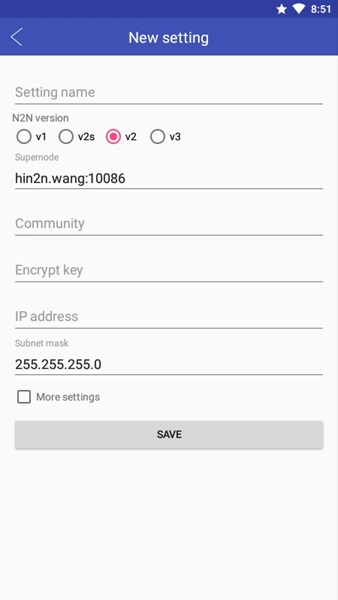 2. N2N version需要选择V3,配置名称可以随便取,接下来需要分别填写主服务器、房间名、密码和虚拟IP位置;