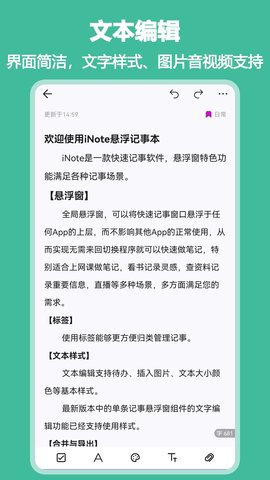 文本编辑支持待办、插入图片、文本大小颜色等基本样式。丰富您的记事内容。