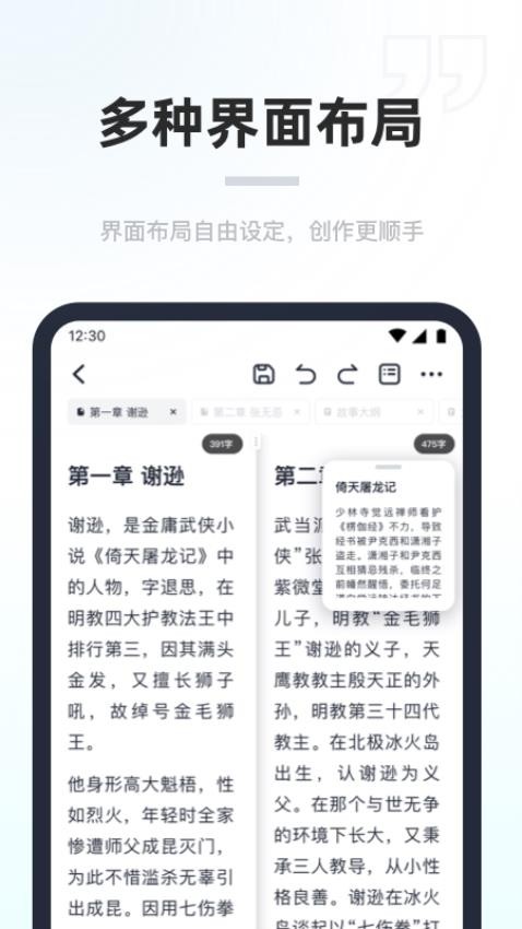 与常规小说创作软件不同,支持局部文字变色、加粗、倾斜等,创作时标记内容,便于后期修改和润色。
