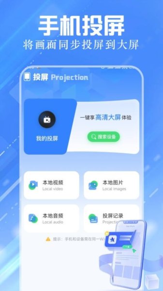 手机同屏是由长沙零柒闪耀信息技术有限公司为大家打造的手机多功能投屏工具,旨在为用户提供高效便捷的投屏和文件传输服务,通过此app,用户可以轻松搜索并连接附近的投屏设备,让手机内容在大屏幕上实现高清播放,无论是本地视频、图片还是音频,都能一键投屏,享受更加舒适的观影体验!