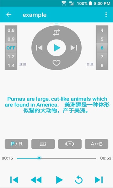 4. 选择要跟读的内容,进入播放界面,点击【P/R】使R亮起,进入跟读模式,可调节速度、音量。右划可进入单句复读模式。