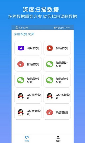 1. 首页提供多项恢复选项,包括微信、QQ、图片及视频等分类;