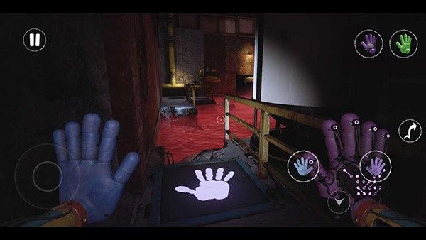 8、继续前行至左侧的门,打开门后会有蒸汽喷出(无需在意),穿过蒸汽,走到楼梯前并上楼,上楼后,你会发现一个操纵台,在这个大厅里,你需要使用蓝色手手收集四个发光的颜色方块(这些方块的位置各不相同),收集完成后,走到角落的门前,用蓝色手手射击门的把手并收回,以打开门进入下一区域。