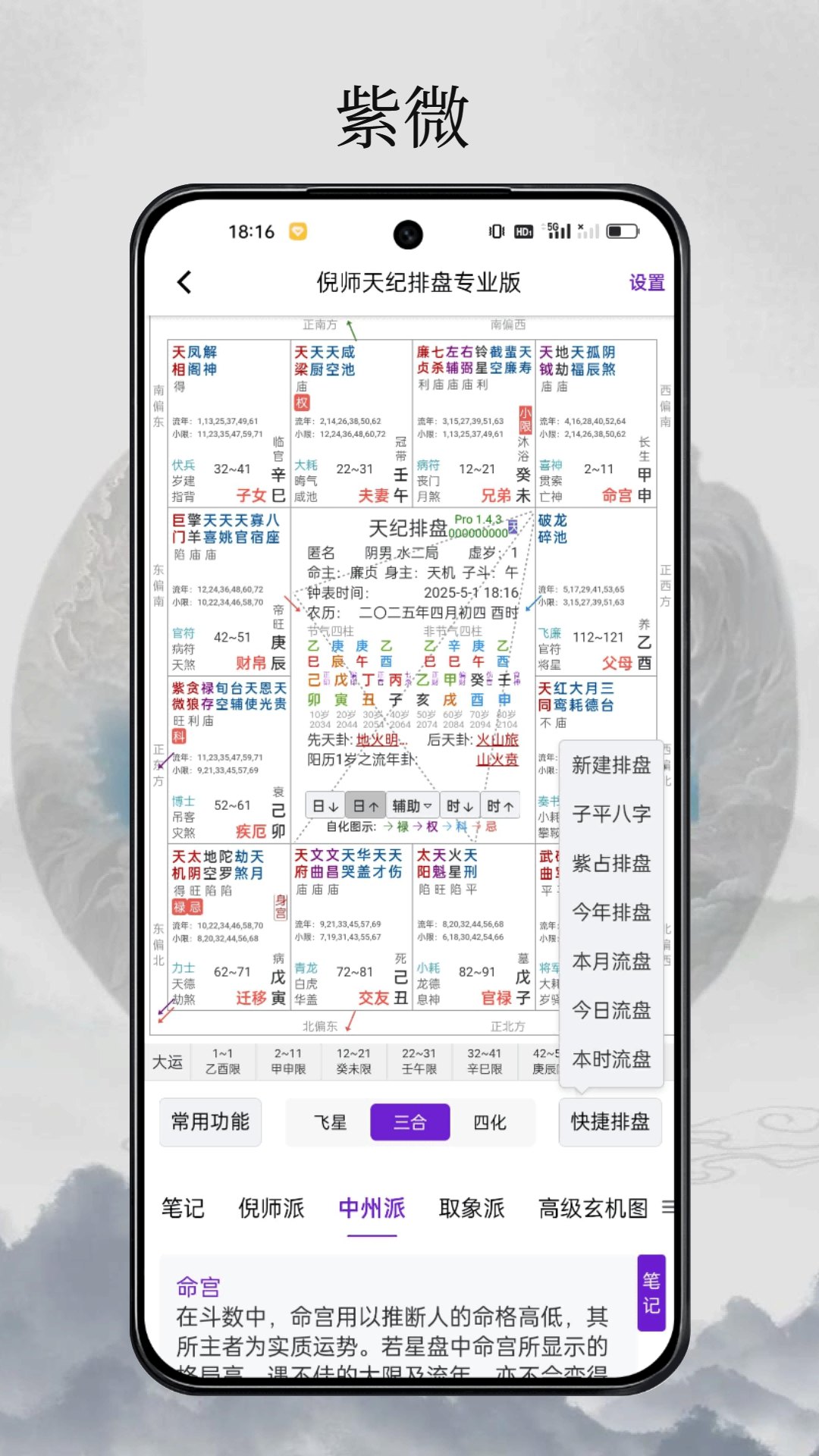 3. 提供了多种排盘方式,包括传统的综合排盘、紫微斗数、四柱八字等。