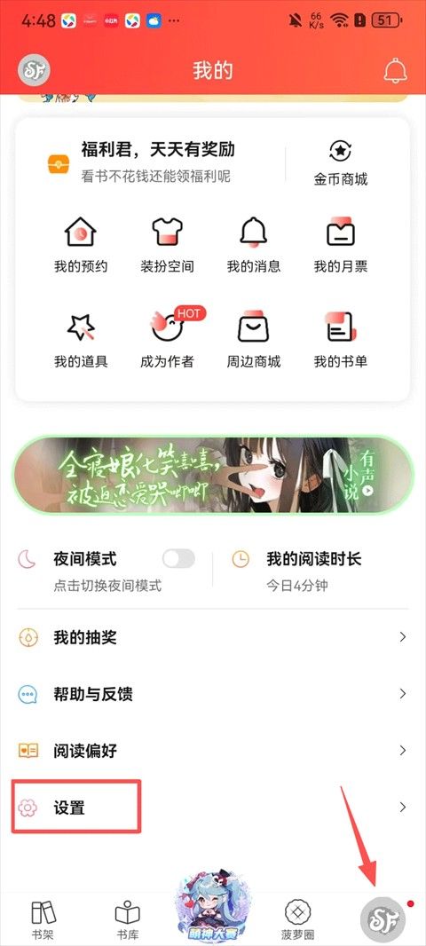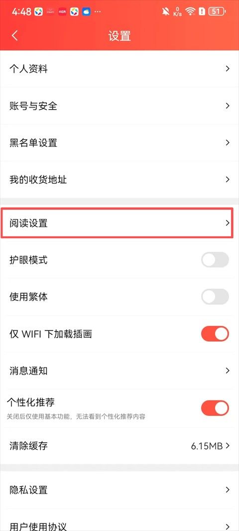 2. 找到并选择阅读设置;