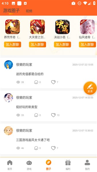 1. 进入781游戏平台之后,点击下方的【圈子】,找到【发表】图标