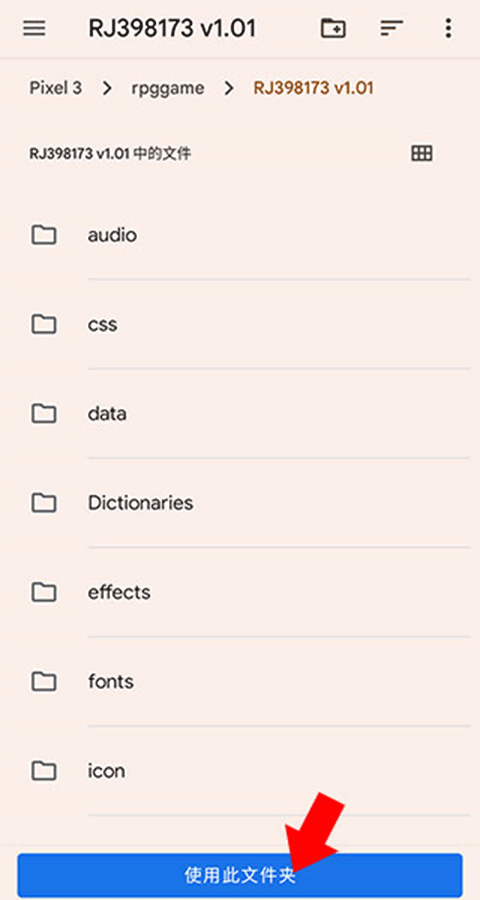 3. 找到我们刚刚解压的游戏目录,并点击下方的使用本目录文件(如果非RPG Maker MV制作的游戏,会弹窗提示无法游玩)