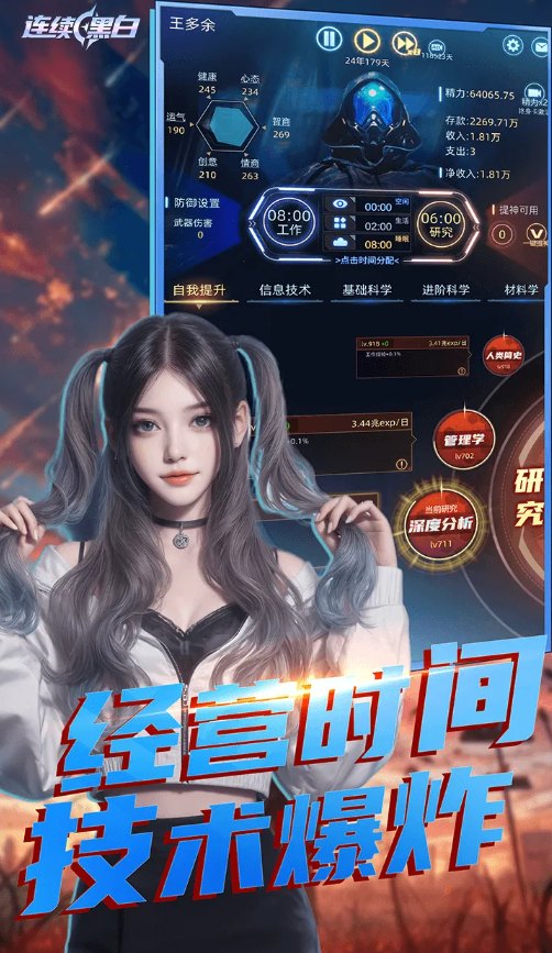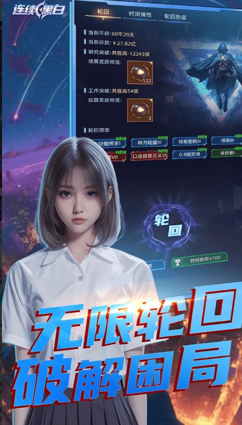 连续黑白是一款创新性的文字星战题材放置手游,它融合了单机游戏的深度与弱联网的轻度社交,为您带来一场零压力、无焦虑的沉浸式宇宙文明演化体验。在游戏中,您将引领人类文明跨越星际,与多元外星种族互动,每一段六十年的轮回都是一次独特的文明发展历程。无论您偏好沉浸数小时的核心游玩,还是享受上线领取福利、离线积累收益的轻松节奏,本作都能完美适配您的需求,助您在浩瀚星海中安心构筑属于自己的传奇。