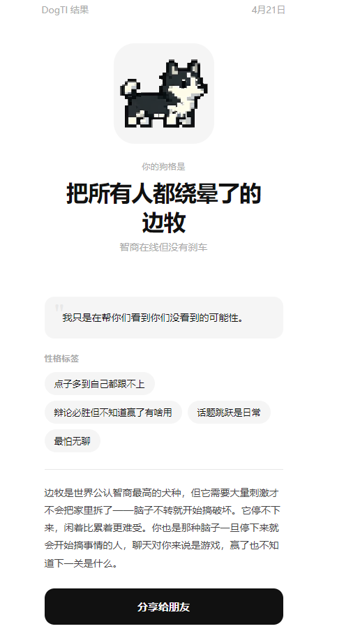 4.测试完成后生成专属结果卡,方便分享给朋友,看看彼此的狗狗缘分。