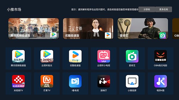 小推市场电视版是一款专为智能电视及大屏设备打造的专业软件,为家庭影音娱乐提供了丰富便捷的一站式解决方案,拥有海量影视软件资源,涵盖各类热门视频平台与实用工具,用户只需通过遥控器简单操作,即可轻松浏览、发现并一键下载安装心仪应用,全程无任何付费门槛或功能限制,整个界面为大屏交互优化,设计清晰直观。