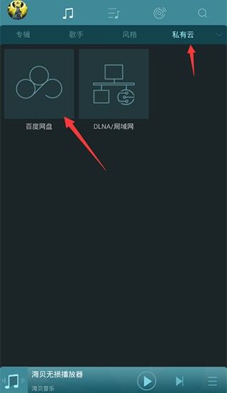 2. 接下来在私有云页面的下方点击“百度网盘”功能,就可以去登录自己的百度网盘账号,从而播放歌曲了;