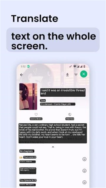 3.在漫画模式下,直接轻触漫画中的任意文本段落,瞬译App会立即显示对应的中文翻译