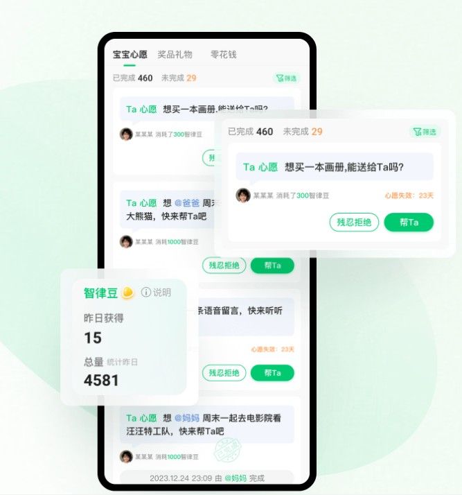当孩子达到预定目标时,系统将自动颁发奖励,辅助孩子改正不合理及无度的索要习惯。