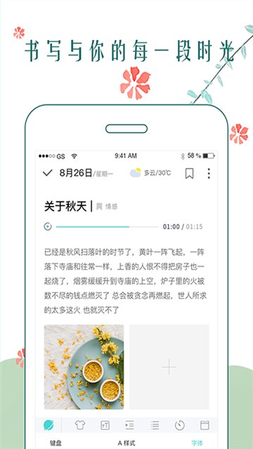 时光日记app是一款非常好用的日记类型的软件,你可以在这里体验到非常丰富的功能以及很简单的操作方式,你能够随时随地的去进行记录以及操作。大家能轻松的去进行一系列的记录以及操作,很多不同的服务都是很给力的并且大家能快速的去进行操作,功能也是丰富的。