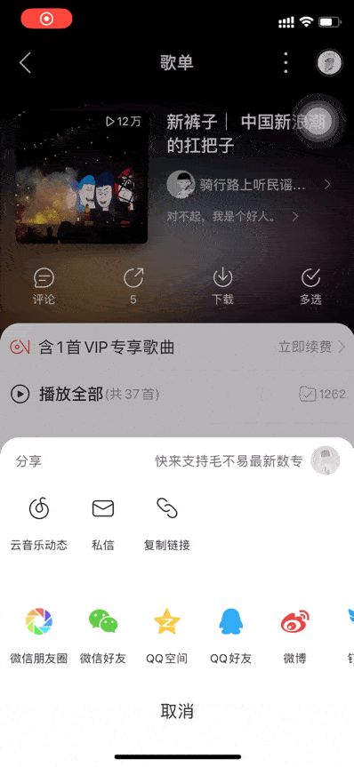 1. 首先,前往该音乐平台,找到想听但显示灰色的音乐,点击【分享】按钮,弹出菜单复制【链接】选项;