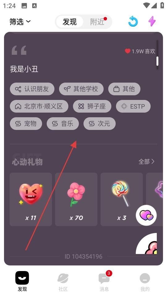 3. 切换至发现页面,查看用户发布的动态,了解其个人标签、心动礼物等信息,参与互动。