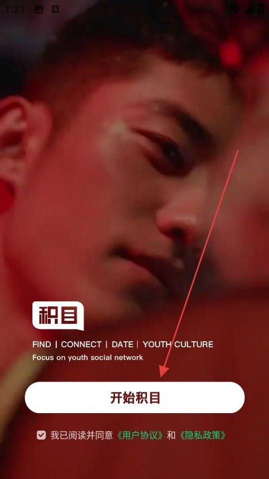 1. 打开积目交友,在初始页面勾选已阅读并同意协议,点击开始积目,进入应用主界面。