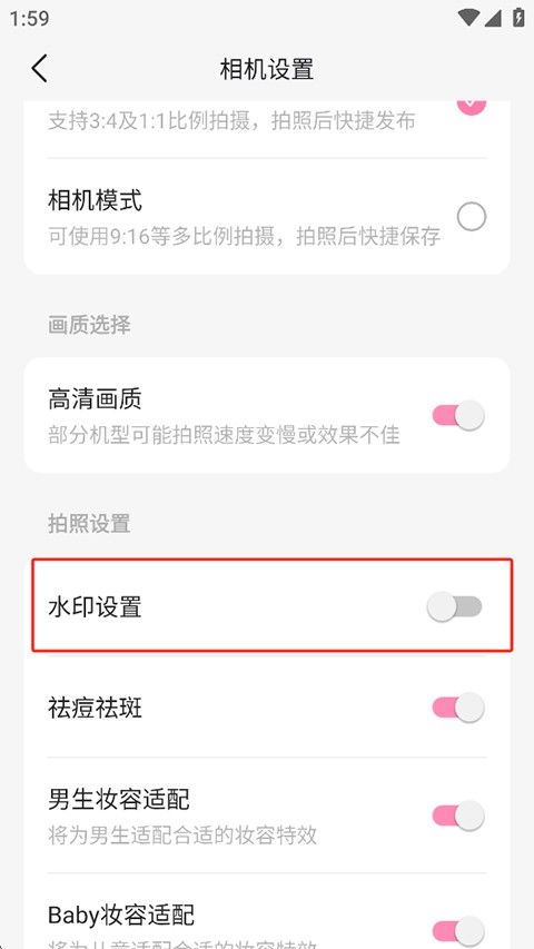 3. 找到“水印设置”开关,关闭即可(部分版本显示为滑动按钮)。