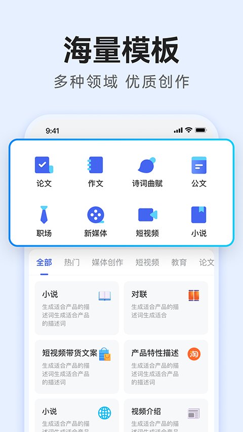1. 提供了大师级别的创作模式,支持各种不同类型的文章的创作,包括小说、行书、对联、总结、报告等,能够为用户提供创作的灵感,拒绝学灵感枯竭。