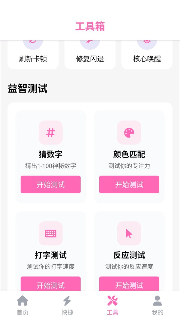 3. 工具箱功能及性能优化:该工具箱涵盖内存分析、性能优化、闪退修复等一系列实用工具,能够精准检测设备内存占用情况,有效解决游戏卡顿问题,显著提升游戏运行的流畅程度。此外,工具箱还配备专注力测试等充满趣味的小工具,进一步丰富玩家的使用体验。