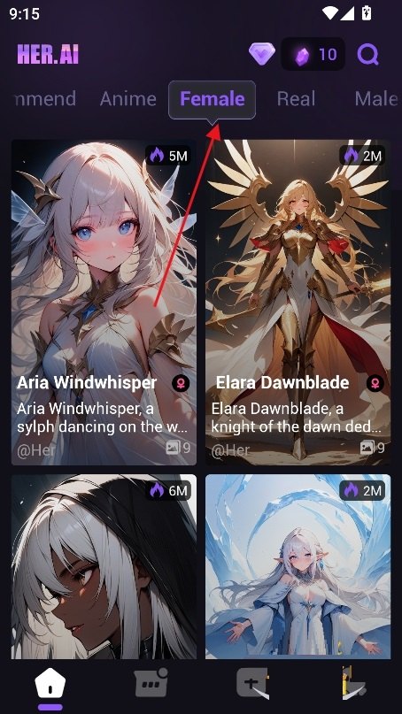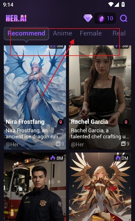 1. 进入Her.AI聊天软件首页,筛选角色类型