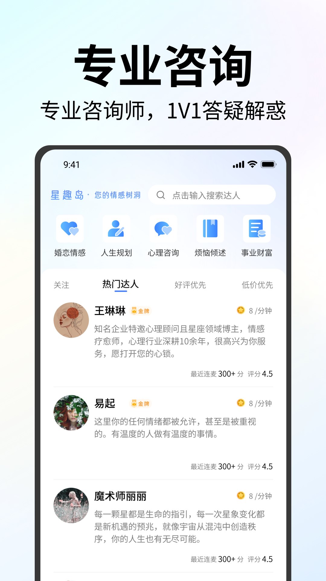 1. 平台所有入驻咨询师均需持有心理咨询、婚姻家庭咨询等权威认证证书,且具备至少5年相关从业经验,专业领域涵盖塔罗、星座、国学、心理、婚恋等多元方向。