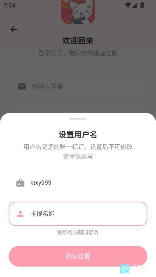 4. 最后设置【用户名】和【昵称】,点击【确认设置】即可完成注册。