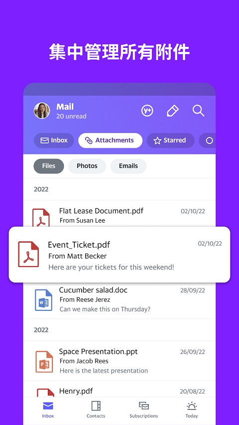 Yahoo邮箱(Yahoo Mail)是一款高效实用的多账号邮件管理应用,支持登录并统一管理Yahoo、Gmail、Outlook等多个邮箱账号,界面简洁、操作便捷,安全性高。应用提供1000GB免费存储空间,支持自定义设置、邮件分类、附件快速查看、一键退订营销邮件等功能,可收发文字、图片、文档、音频等多种格式邮件,适合日常办公与国际通讯使用,能有效提升邮件处理与办公效率。