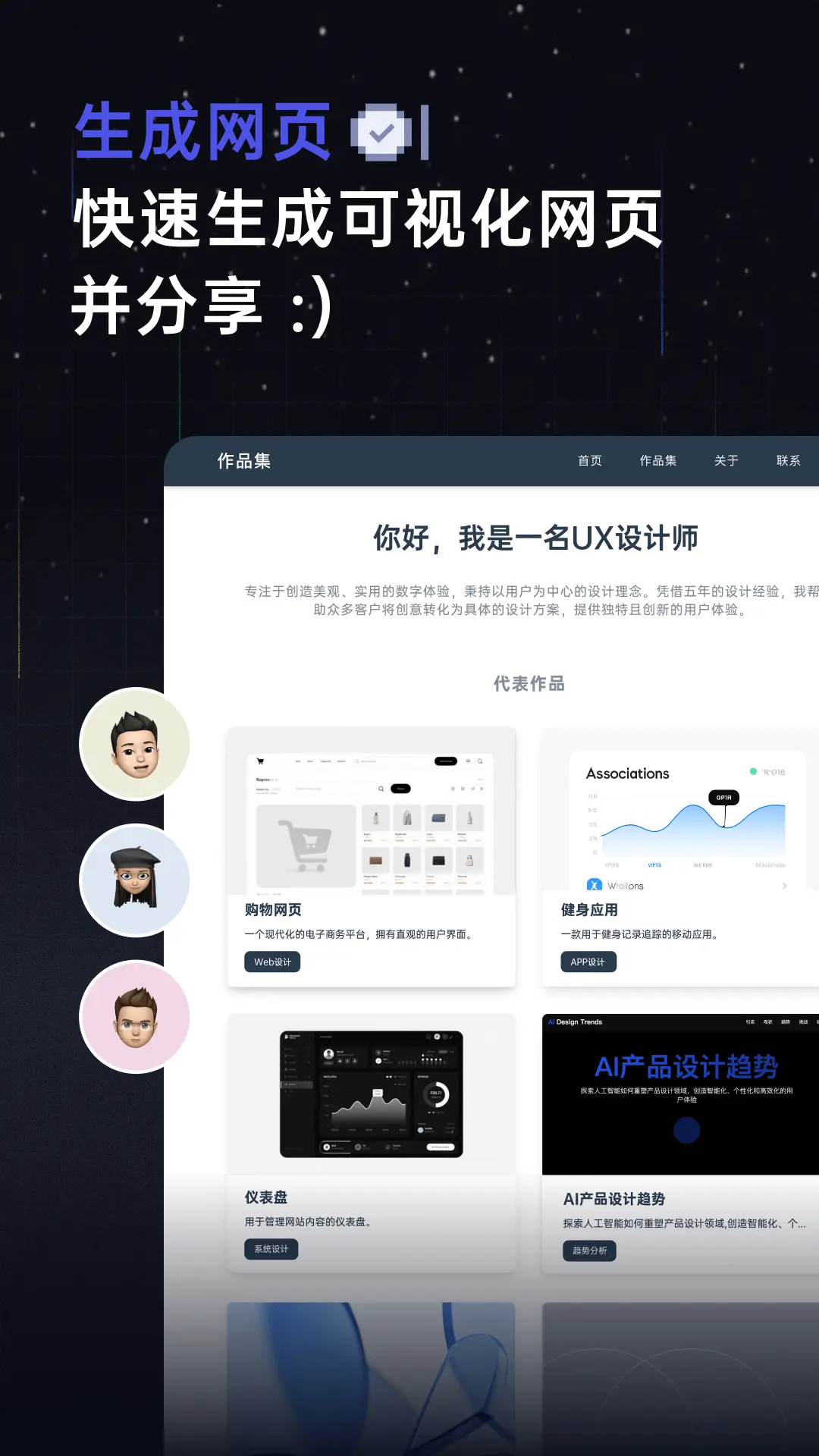 3. 生成网页一键分享:输入需求生成个性化网页,添加元素后一键分享。
